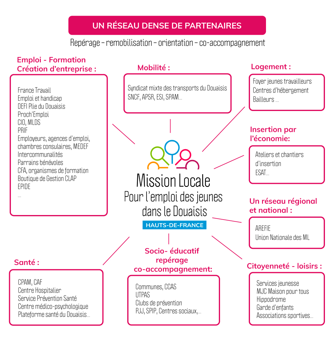 La Mission Locale vous accompagne dans cette démarche de parrainage, en vous proposant un cadre clair, des temps d’échange et un suivi régulier. Vous n’êtes jamais seul(e) dans cet engagement : vous faites partie d’un réseau solidaire, mobilisé pour l’avenir des jeunes du territoire. « Seul(e) on va plus vite, ensemble on va plus loin. » C’est dans cet esprit de coopération que la Mission Locale du Douaisis s’appuie sur un réseau de partenaires engagés pour mener à bien sa mission de service public en faveur de l’insertion professionnelle, sociale et citoyenne des jeunes.