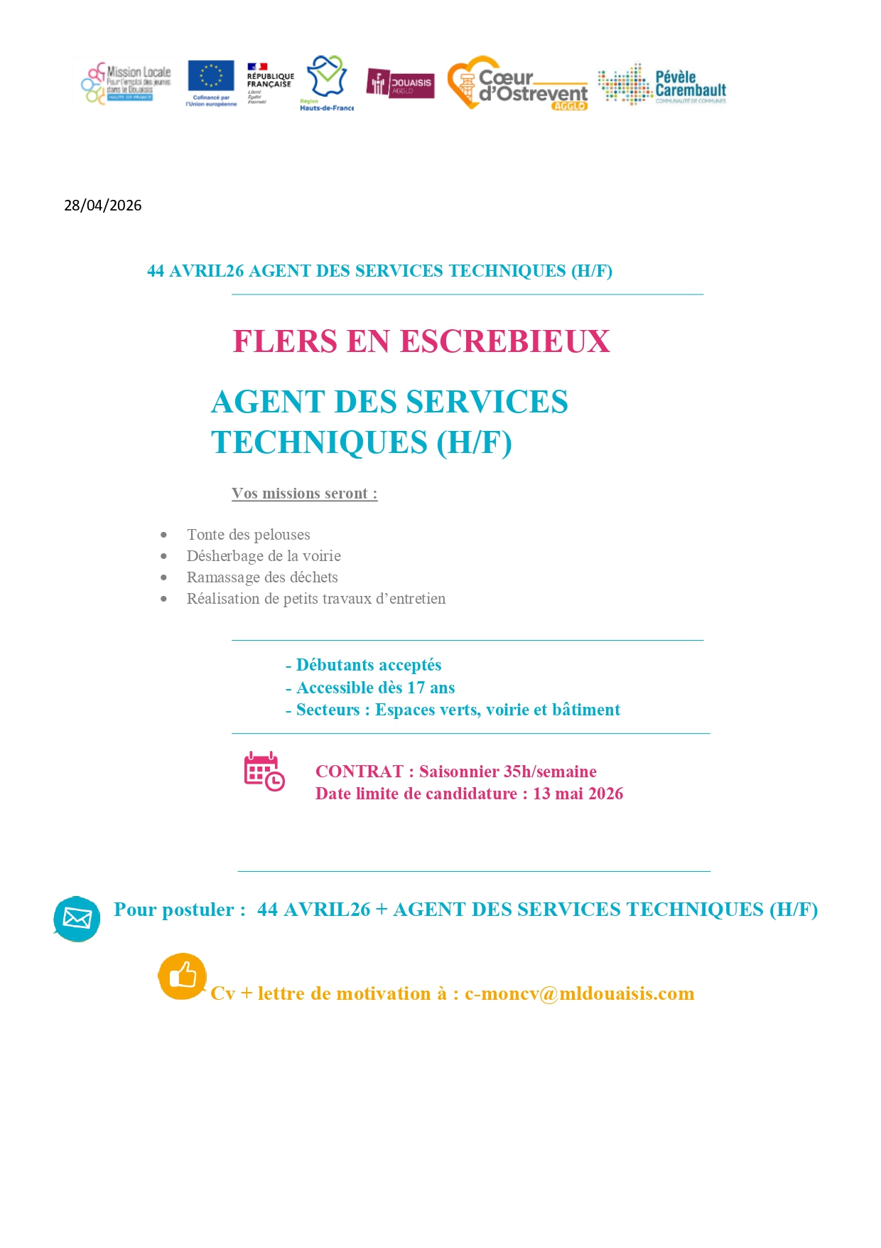 Emploi Flers-en-Escrebieux Publié le 29/04/2026 N° offre : 44 avril 2026 Pour postuler, envoyez votre CV par e-mail à c-moncv@mldouaisis.com
