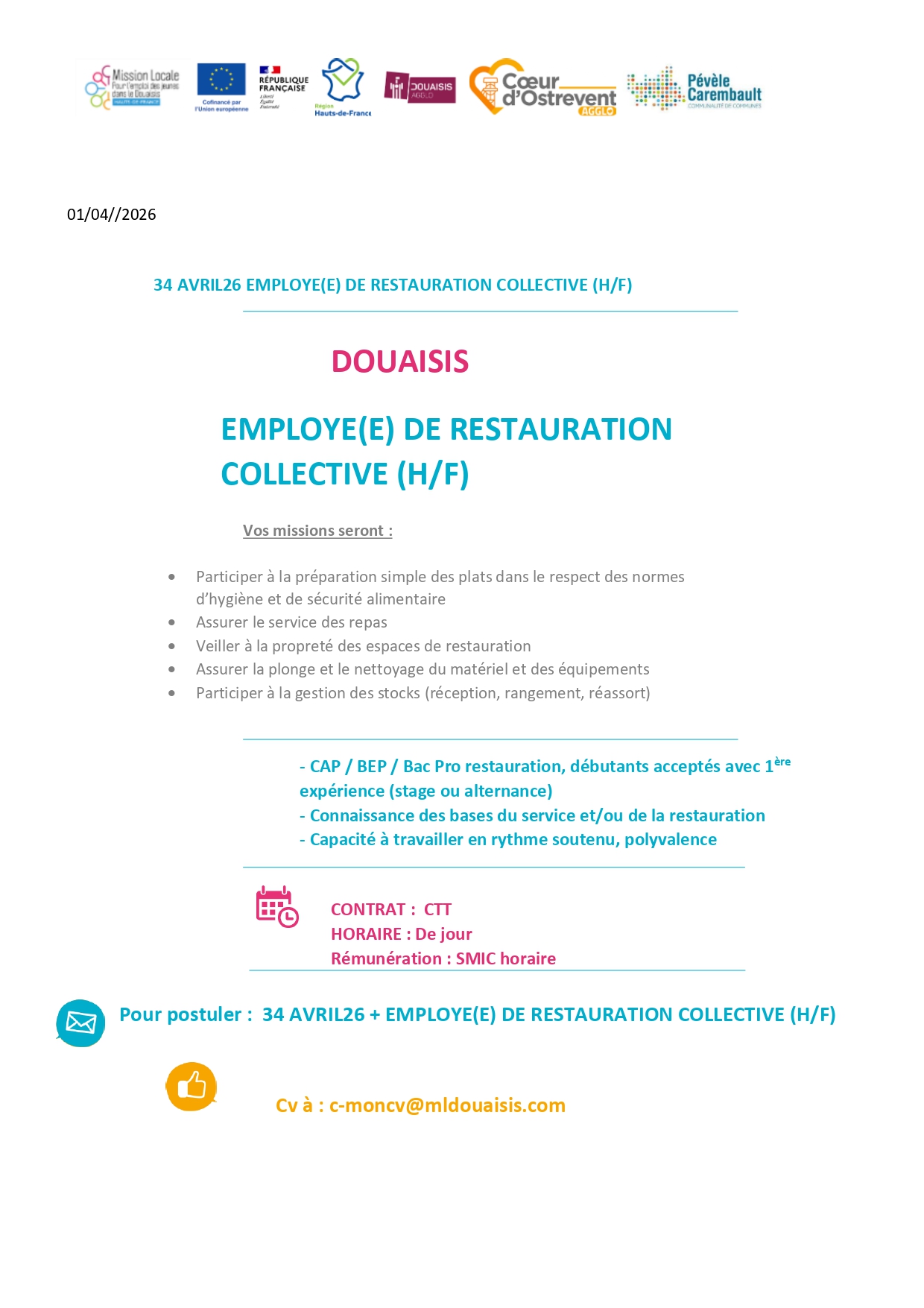 Pour postuler, envoyez votre CV et votre lettre de motivation par e-mail à c-moncv@mldouaisis.com