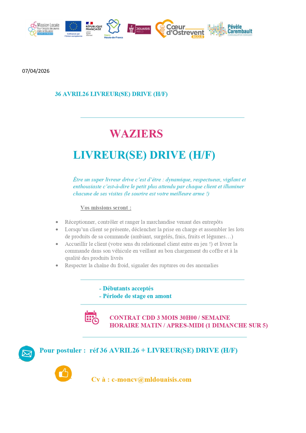 Emploi Waziers Publié le 08/04/2026 N° offre : 36 avril 26 Pour postuler, envoyez votre CV par e-mail à c-moncv@mldouaisis.com