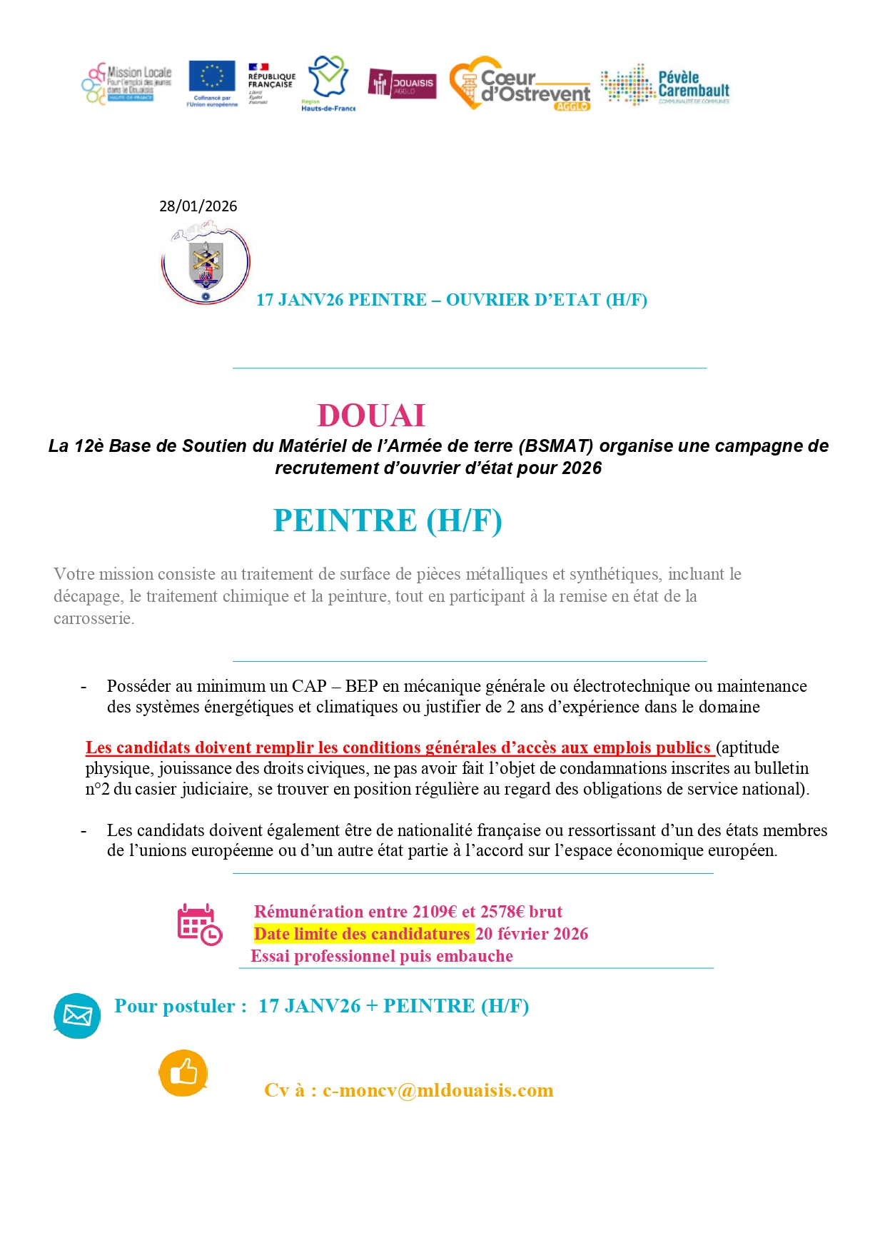 Pour postuler, envoyez votre CV et votre lettre de motivation par e-mail à c-moncv@mldouaisis.com