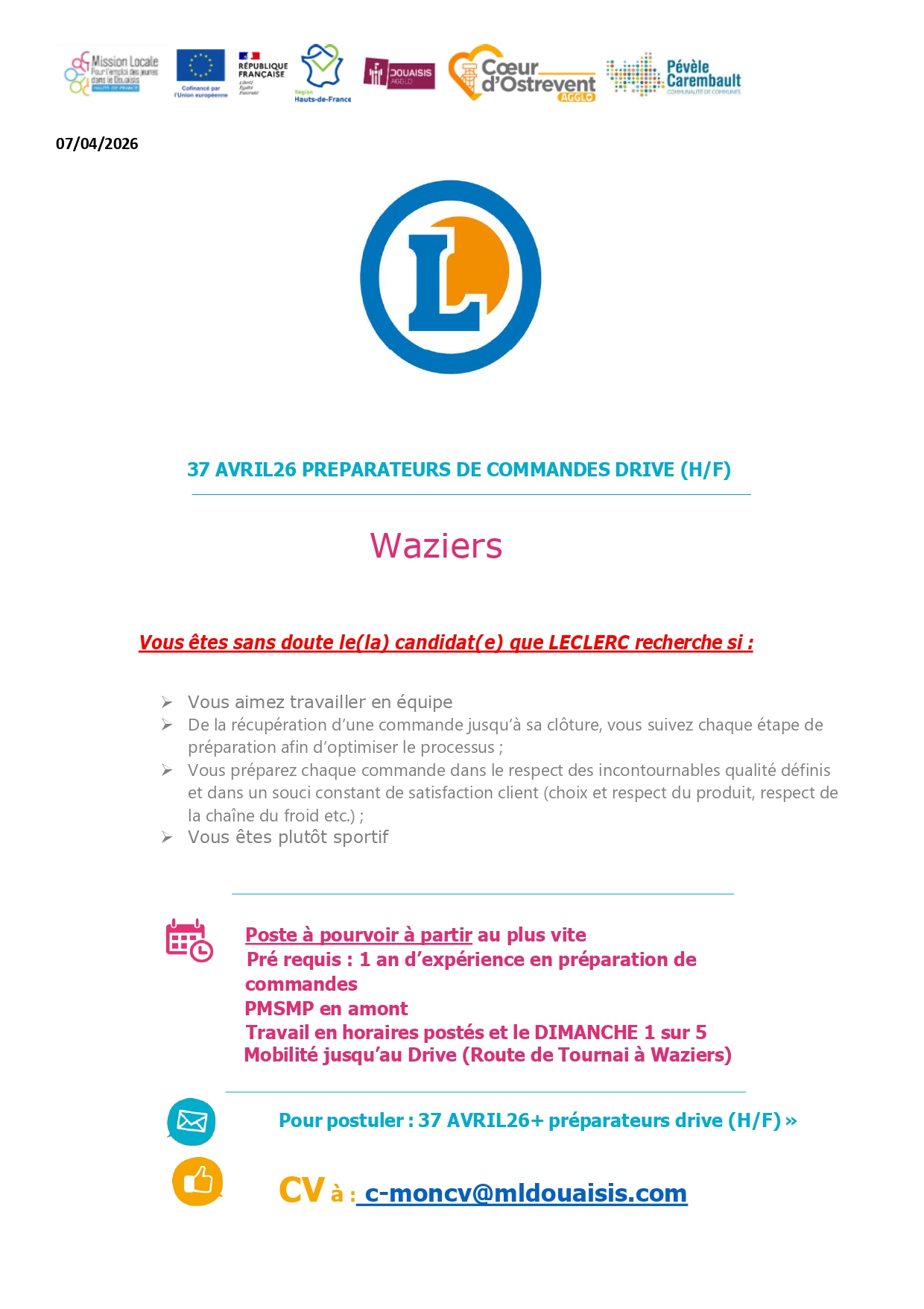 Emploi Waziers Publié le 08/04/2026 N° offre : 37 avril 26 Pour postuler, envoyez votre CV par e-mail à c-moncv@mldouaisis.com