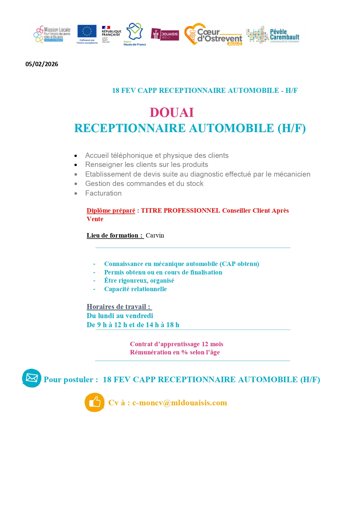 Pour postuler, envoyez votre CV et votre lettre de motivation par e-mail à c-moncv@mldouaisis.com